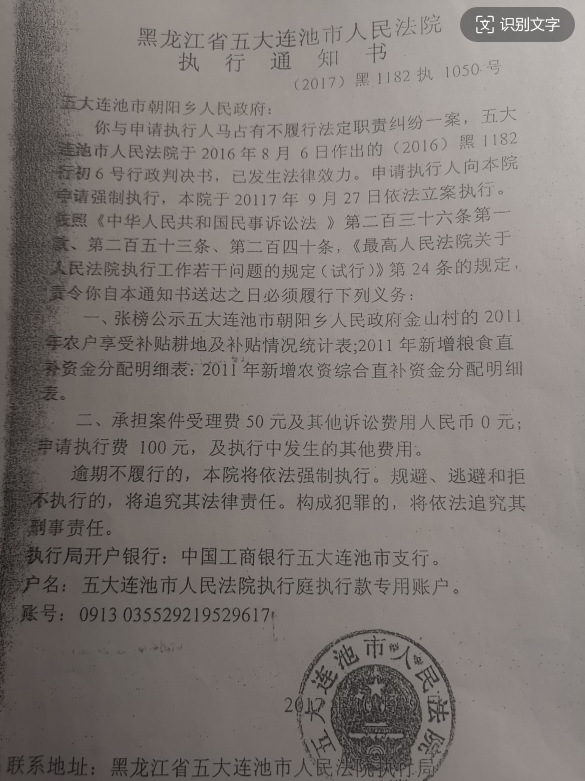 判决生效后,乡政府拒不执行,为此五大连池市法院下达(2017)黑1182执1050号执行通知书。
