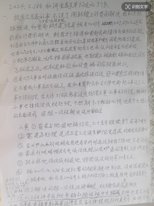 对此,马占有表示同意,但前提是请求政府解决他的其它诉求:平反马占有“莫须有”被刑拘6个月的冤情;在他被限制人身自由期间被抽走的79亩耕地损失、补贴问题;要求公开公布村委2018年至今的账目;孙占林地依法垦地和补偿;按照2017年会议纪要解决到位等,因为这些才能够证明他是清白的。