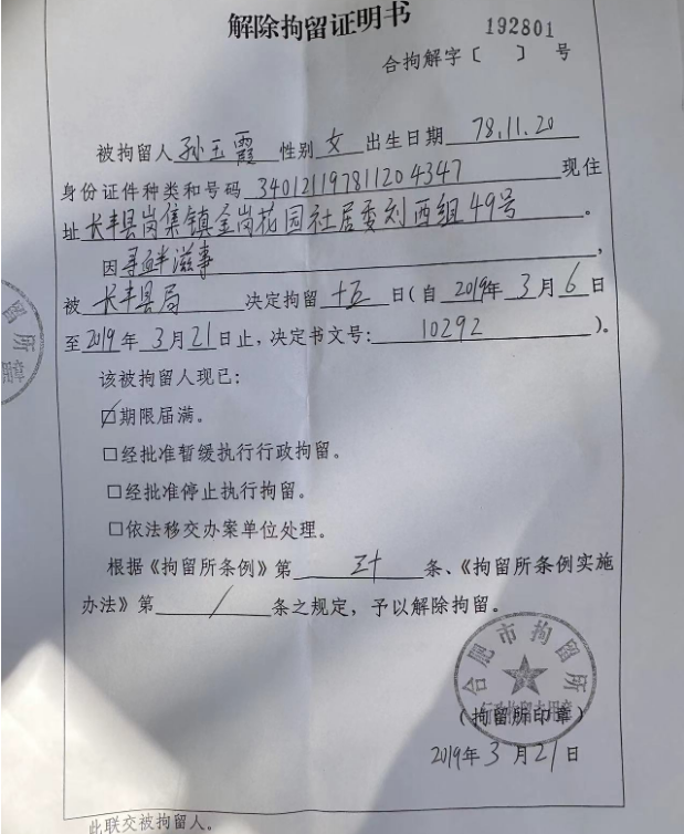 由于岗集镇和金岗花园居委会没解决我们母女房屋确权和拆迁补偿安置的合理诉求,被逼无奈之下,我曾到上级有关部门反映求助,同时为了保护自己,我换名到处打工供养女儿上演读书。2019年1月14日以“扰乱公共场所秩序”为由我被合肥市拘留所拘留7天。