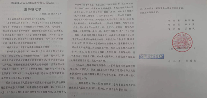 2018年8月8日,依安县法院重新组成合议庭对本案公开审理,10月11日作出实质性维持的判决,刘喜明再次被判处有期徒刑十一年。