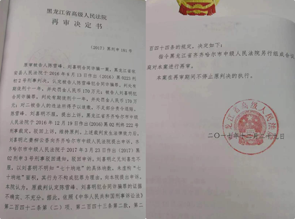 2017年12月29日,黑龙江高级法院作出(2017)黑刑申181号再审决定,认为:刘喜明犯合同诈骗罪的定罪证据不确实、不充分,指令齐齐哈尔市中级法院另行组成合议庭对本案进行再审。