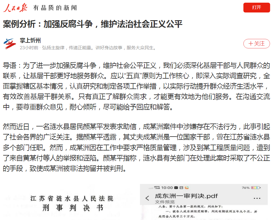 相关资料导读: 一、“成东洲被诬陷”事件的由来: 2022年初,时任江苏省涟水县农村农业局分管工程质量的副局长成东洲,因为淮安淮河水建包工头黄某等人承包的一个工程项目质量严重不合格,成东洲要求黄某整改,后被黄某拒绝,此后黄某气急败坏了!因为工程整改他要付出巨资,黄某连续向涟水县纪委、监委写了多封举报信,诬告成东洲受贿且在北京,上海,海南等地都有房产,后经涟水县纪委调查后证实“均不属实”!都是黄某为了打击报复成东洲,伪造的污蔑证据;2023年3月,成东洲查出黄某承包的一个工程项目又存在严重的质量问题,成东洲立即要求黄某整改,又被黄某拒绝了;3月底,时任涟水县(刘姓领导)打电话把成东洲叫到办公室,要求成东洲对黄某工程网开一面,由于成东洲本着对工作认真负责的态度,为了避免国家工程遭受损失,没有答应;2023年5月初,成东洲被淮安市淮河水建董事长王某等人举报受贿36万余元,没有提供任何有效证据,并于2023年5月5日被涟水县某部门以“收受贿赂罪”留置审查。 涟水县某部门在留置审查期间,对成东洲变相刑讯逼供导致成东洲在2023年5月8号晚上发生心绞痛,涟水某部门在成东洲“病危”的情况下,才把成东洲送到淮安市第二人民医院进行抢救,在医院简单检查后,当晚又被涟水某部门带回留置场所,成东洲在法庭审理时,自己供诉血压高达220的时候,涟水某部门依然没有让他休息,那怕当事人请求5分钟的时间,连续长时间对成东洲进行逼供,留置审查期间,涟水县某部门多次让成东洲长时间保持端坐姿势,导致成东洲臀部皮肤严重破损,导致成东洲得了痔疮和腰部长时间疼痛劳损,涟水县某部门多次利用成东洲家人的人身安全威胁成东洲承认自己受贿等污证事项。