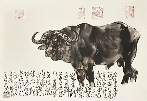 阔海先生画牛,可以说是千姿百态,帧帧不失大写意之魂。或卧牛、行牛、耕牛、牧牛,或单牛、双牛、群牛,或老牛、小牛、母子牛,或食草牛、小憩牛、孺子牛,或凝目、回眸、俯首、哞鸣,或牛气冲天,或天牛卧看(题跋杜牧《秋夕》:“银烛秋光冷画屏,轻罗小扇扑流萤。天阶夜色凉如水,卧看牵牛织女星。”),皆刻画惟妙惟肖,多一笔嫌碎,少一笔不够,深得大写意精髓。既写实又写意,是王阔海先生既不与前人同,也不与现代李可染相同的自家画法,由此把中国画大写意画牛,推向一个更高的高度。